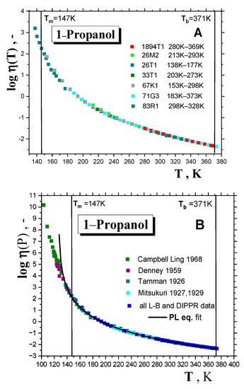 Viscosity of a good glass–former 1–propanol over (A) a restricted temperature range from Tb down to slightly below Tm using the data sets summarized in Ref. [33] (Landolt–Börnstein Table data) and Ref. [34] (DIPPR data), and (B) an extraordinarily wide temperature range from Tb down almost to Tg with the addition data from Refs. [35,36,37] in the strongly supercooled liquid state, as well as from Ref. [38] in the liquid one, together with the best PL equation fitting. The original references marked, such as 1891T1 and 26M2, can be found in Ref. [33].