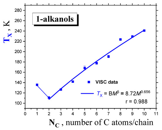 Dynamic crossover temperature TX of 1−alkanols as a function of the molecular size expressed by the number of C atoms in the chain NC. The fit of the TX values from VISC data via the PL equation of the form TX = BM β is included.