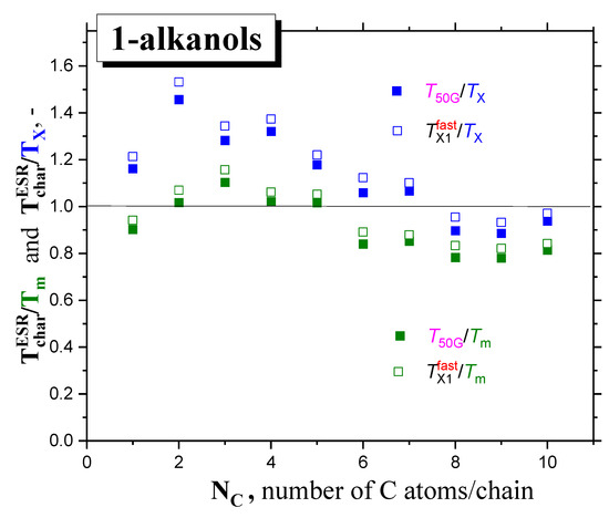 In Figure 8, global comparisons of the characteristic ESR temperatures T50G and TX1fast with the aforementioned thermodynamic and dynamic temperatures Tg, TX and Tm are presented. In all the cases, the slow-to-fast transition in all 1−alkanols occurs above the corresponding glass−to−liquid transition, Tg, i.e., in the amorphous phase of liquid sample or in the local amorphous liquid zones of partially crystalline matrices, at least. Figure 9 expresses these comparisons in terms of the corresponding ratios: T50G/Tm, T50G/TX and TX1fast/Tm, TX1fast/TX. We can approximately distinguish two distinct regions of these ratios with a boundary at around C5OH