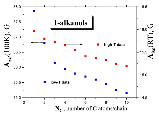 Figure 10 displays the anisotropic hyperfine constant, Azz’ (100K), and the isotropic. hyperfine constant, Aiso(RT), of the TEMPO as a function of the chain length in the series of 1-alkanols studied. Our values of Aiso (RT) for TEMPO are quite consistent with the few obtained for lower members of our series, namely, C1OH–C4OH [42,43,44]. Although both the quantities decrease with increasing chain size, a significant difference can be found in the corresponding trends. The former quantity shows two clear regions of distinct behavior: a sharper decreasing trend for low-M members, and a weaker one for higher M members above NC~4. On the other hand, the Aiso (RT) parameter is slightly reduced with a suggestion of a slight change at NC~6 as the number of C atoms in the molecule, NC, increases.