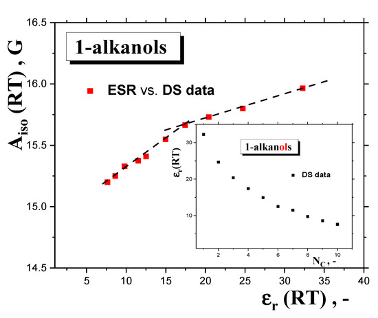 These basic empirical findings can be discussed in relation to the polarity of a set of polar media, with the dissolved polar spin probe TEMPO μTEMPO~3 D [45], from both the phenomenological and theoretical viewpoints. First, the Aiso(RT) values can be related to various measures of the polarity of the medium, e.g., the dipole moment of the medium‘s molecule, μentity,x, as a measure of the polarity of the individual entity in a given phase state x = gaseous or liquid state or the static dielectric constant of the medium, εr (RT), as a measure of the polarity of the bulk liquid medium, as listed in Table 1. In the first case, evidently, no relationship can be found due to the quasi-constant values of the gaseous-phase μg = 1.66 ± 0.05 D [34] or the liquid-phase μl = 2.84 ± 0.15 D dipole moments [39]. On the other hand, Figure 11 displays the mutual relationships between the isotropic hyperfine constant, Aiso (RT), and the dielectric constant, εr (RT), of 1−alkanols [34], together with those of the latter quantity at RT as a function of the number of C atoms in the chain inserted. Both the quantities decrease with NC, resulting in an Aiso (RT) vs. εr (RT) relationship, with approximately two regions showing distinct behavior: (i) for the lower polar 1−alkanols (C10OH-C5OH) with εr < ~17, with a strong sensitivity of Aiso (RT) to polarity and a weak one to proticity, and (ii) for higher polar 1−alkanols (C3OH-C1OH) with εr > ~17, with the weak sensitivity of Aiso (RT) to polarity and a stronger sensitivity to proticity, due to the increased population of HO-groups potentially interacting with the spin probe TEMPO molecule. The apparent boundary between both regions occurs at NC = 4–5, i.e., for 1−butanol or 1−pentanol, where the εr (RT) vs. NC (RT) plot changes rather notably from a sharply decreasing dependence to a slightly decreasing one, and where, at the same time, conformational degrees of freedom and related enhanced alignments of the apolar parts of the molecules start to occur. Interestingly, in spite of the absence of εr (100 K) data facilitating their direct comparison with Azz’ (100K), the boundary for this quantity seems to be consistent with that for Aiso (RT), suggesting a significant role of polarity and proticity in both the mobility states of the spin probe TEMPO. These findings of the solvent dependence of the different ESR parameters are consistent with the previous ones for Aiso (RT) [46,47], as well as for Azz’ (77 K) [48,49].