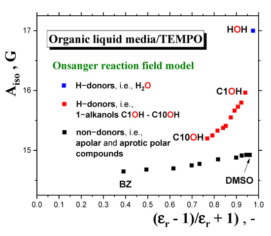 However, it is evident that this division is rather arbitrary and very rough, because the former “apolar” region also includes many of our polar 1−alkanols. In connection with the aforementioned empirical relation between spectral parameters and bulk polarity, more elaborate theoretical approaches, based on models using the medium as a dielectric continuum with dielectric constant, εr, and the molecular solute, e.g., polar spin probe, as a molecular entity localized in a spherical cavity [47,51], can be discussed. Within the reaction field concept of the polarization of the continuum medium by the polar solute, one obtains for the Onsager’s reaction field [52] and Böttcher’s reaction field [53] the following functional relations: Aiso = f [(εr − 1)/(εr + 1)] [47], or Aiso = f [(2εr + 1)/(2εr + nD2)], where nD is the refraction index of the pure nitroxide [51]. Figure 12 displays a test of the validity of the first functional dependence for two basic groups of organic compounds at RT doped by TEMPO. The first is represented by a series of apolar and aprotic polar solvents, which range from apolar benzene (BZ) with εr (RT) = 2.3, to a highly polar but aprotic dimethyl sulfoxide (DMSO) with εr (RT) = 48.9, as taken from Ref. [50]. The other group, including our series of ten 1−alkanols from methanol with εr (RT) = 33 to 1−decanol with εr(RT) = 7.9, differs significantly from the predicted linear trend due to the specific protic character of the molecules, allowing for H-bond formation between the polar spin probe TEMPO molecule and the alkanol’s one. This is quite consistent with the maximal value of Aiso (RT) = 17 Gauss [44] for highly polar and protic water, where εr (RT) = 80.4 [50]. The relatively large difference between water and the first member of the alkanol family is determined on the basis of theoretical calculations using density functional theory (DFT) interpreted in terms of the complexation of nitroxide with two water or one methanol molecules, respectively [45,50]. Moreover, a closer inspection of this group of protic polar compounds confirms the distinction of a series of 1−alkanols into two subgroups, with distinct slopes of Aiso (RT) as a function of the corresponding dielectric function: (i) weaker for higher members from C10OH to C6OH, and (ii) stronger for shorter ones from C5OH to C1OH, with an approximate boundary between C5OH and C6OH, i.e., for εr (RT)~16.5. A similar situation can be found for the Böttcher reaction field due to the linearity between the respective functional forms. Both these findings appear to be consistent with the empirically determined boundary at C4OH-C5OH, as seen from the Aiso (RT) vs. εr (RT) plot without the inclusion of the polarization interaction between the polar solute and the solvent, as shown in Figure 11.