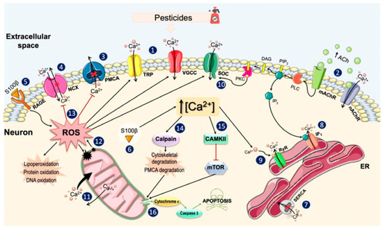 Main mechanisms of action of pesticides on neuronal Ca2+ homeostasis. Reproduced from Ref. [35]. Published in this Special Issue by MDPI, 2021. Exposure to pesticides induces a series of changes in the plasma membrane that include: (1) the opening of the VGCCs (especially the L- and T-types) and some TRP channels, which allows the Ca2+ influx and enhances the membrane depolarization; (2) the activation of nicotinic acetylcholine receptors (nAChR) and muscarinic acetylcholine receptor (mAChR) through increasing the availability of acetylcholine and/or by binding directly to these receptors; (3) the inhibition of plasma membrane Ca2+-ATPase, the main Ca2+ extrusion mechanism; (4) alterations in the Na+/Ca2+ exchanger, completely inhibiting its activity or activating its reverse mode. Pesticides also increase the S100β levels, which (5) bind to the receptor for advanced glycation end products in the extracellular side and favor the production of reactive oxygen species (ROS) and (6) increase the Ca2+ levels in the intracellular medium. In the cytosol, pesticides induce the depletion of the endoplasmic reticulum (ER) Ca2+ reserves by (7) inhibiting the sarcoplasmic (endoplasmic) reticulum Ca2+-ATPase, responsible for sequestering Ca2+; (8) stimulating the inositol 1,4,5-trisphosphate (IP3)-induced Ca2+ release; and (9) via Ca2+ release through RyRs stimulated by cytosolic Ca2+. When the Ca2+ content of the ER begins to decline, the protein kinase C (PKC) stimulates the influx of Ca2+ through the store-operated channels (SOC) (10) and the mitochondria assume the role of the Ca2+ reservoir, rapidly accumulating large amounts of Ca2+ and slowly releasing it (11). The overload of Ca2+ in the mitochondria increases ROS levels and its release to the cytosol (12), where they enhance the [Ca2+]i by stimulating Ca2+ channels and inhibiting their expulsion mechanisms, damaging lipids, cell proteins, and DNA (13). Increases in ROS and Ca2+ levels activate calpains and Ca2+/calmodulin-dependent protein kinase II (CAMKII). Calpains induce the degradation of elements of the cellular cytoarchitecture (14), while CAMKII inhibits mammalian or mechanistic targets of rapamycin (mTOR) (15). These two pathways can ultimately cause the release of pro-apoptotic factors from the mitochondria, finally leading to cell death (16).