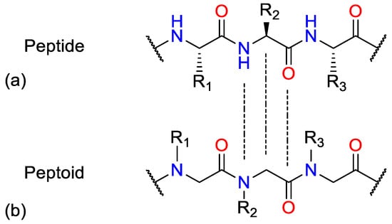 Repeated combinations of poly-N-substituted glycine (NSG) form peptidomimetic compounds known as peptoids []. They are a class of artificial, unnatural peptide mimics that have a modular structure that allows a wide variety of structural components to be easily incorporated. Peptoids have the functionality of their side chains linked to the nitrogen of the polyamide backbone instead of the α-carbon, creating an achiral and flexible oligomeric backbone without hydrogen bond donors. This N-alkyl backbone repeat motif allows peptoids greater stability against proteolytic degradation than analogous peptides []. Additionally, NSGs may be more hydrophobic and possess higher cellular permeability [,,]. Figure 1 shows the similarities between peptides and peptoids in the spacing of the side chains and carbonyl groups and the variations in the chirality of the two monomers [].