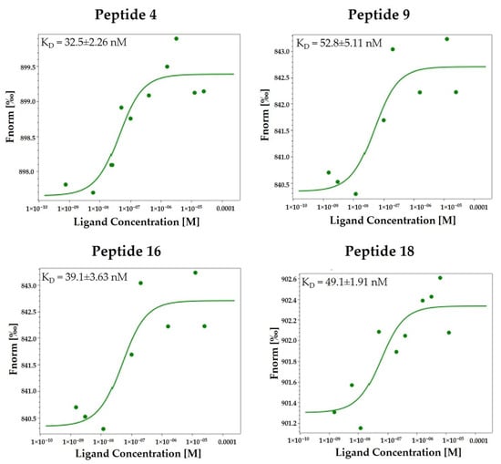 The 16 compounds were subjected to MST screening, as described in Materials and Methods (Section 3), and the results are shown in Table 1. According to the analysis, every peptide interacts with HA with different dissociation constants. Compounds 4, 9, 16, and 18 bind HA more effectively than compounds 1 and 2, showing an equilibrium dissociation constant (KD) value in a two-digit nanomolar concentration range (Figure 2).