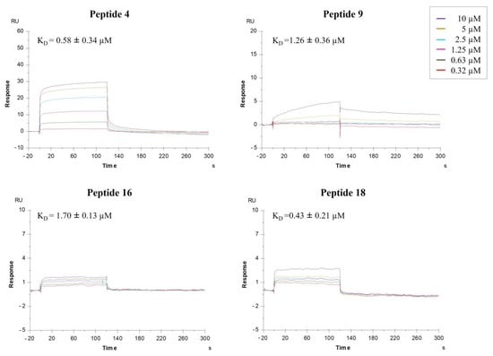 The SPR study revealed that synthesized peptides effectively interact with the immobilized protein. The sensorgrams of the compounds 4, 9, 16, and 18 bound to HA in HBS-P buffer are shown in Figure 3. Interestingly, these peptidomimetics bind HA with higher efficiency with respect to 1 and 2, showing a KD value in a three-digit nanomolar concentration range.