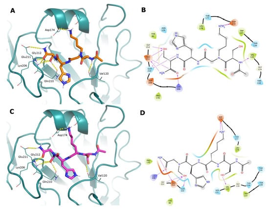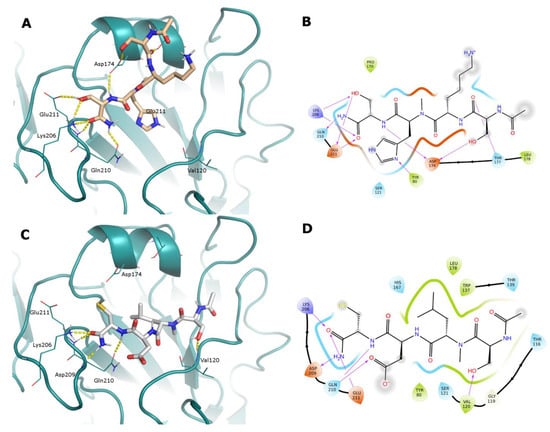 (Panels (A,C)) Docked poses of N-methyl peptides 9 and 4 represented as sticks (light orange and white C atoms, respectively) in the RBS of A/Parma/24/09 H1N1 (deep-cyan cartoon). Just the HA residues that interact with the ligands are shown as lines for clarity’s sake. H-bonds are represented as yellow dashed lines. (Panels (B,D)) Corresponding 2D ligand interaction diagrams; in these diagrams, residues close to the ligand are colored according to their properties (orange, negatively charged; blue, positively charged; green, hydrophobic; cyan, polar); H-bonds are shown as magenta arrows; and a gray shadow encircles atoms that are exposed to the solvent.