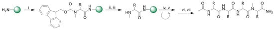 General synthesis of N-methylated peptide. Reagents and conditions: (i) Fmoc-N-Me-Ser(tBu)-OH (3 eq.), HBTU (3 eq.), HOAt (3 eq.), DIPEA (6 eq.), 2 × 20 min, MW 35 °C; (ii) piperidine/N,N-dimethylformamide (DMF, 2:8, v/v) × 10 min rt; (iii) piperidine/DBU/toluene/DMF (5:5:20:70, v/v) 2 × 5 min rt; (iv) Fmoc-L-aa(PG)-OH (3 eq.), HBTU (3 eq.), HOAt (3 eq.), DIPEA (6 eq.), 2 × 10 min, MW 75 °C; (v) 20% piperidine/DMF 1 × 30 min rt; (vi) Ac2O/ dichloromethane (DCM) (1:3 rt); (vii) TFA/TIS/H2O (95:2.5:2.5 v/v).
