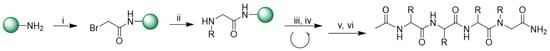 In the solid-phase synthesis of peptoid, there are two distinct methods to introduce a N-alkylglycine (peptoid residue) on the growing peptide chain: (i) the N-substituted glycine derivative, appropriately protected at the tertiary nitrogen atom, can be prepared distinctly and used as a building block in the solid-phase procedure (monomer method) [,], or, alternatively, (ii) the peptoid residue is created during the growing peptide chain by combining two submonomers, a haloacetic acid and a primary amine (submonomer approach) [].