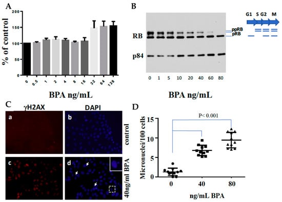 Effects of BPA on Cell Growth, Cell Cycle, DNA Double-Strand Breaks, and Micronuclei Formation in MCF7 Cells. (A) MCF7 cells were seeded at 5 × 103 cells/well and incubated for 24 h. Subsequently, a fresh medium containing various doses of BPA was added, and cells were cultured for 96 h. Following this, XTT solution was added for a 4-h incubation at 37 °C. Absorbance was measured at 450 nm using a microplate reader. The values represent the mean ± SEM of six replicates. (B) MCF7 cells were treated with different doses of BPA for 72 h. Total protein lysates were extracted and subjected to SDS-PAGE analysis, focusing on RB expression. Protein loading was verified using p84 expression. (C) MCF7 cells were cultured on coverslips in 6 cm plates in the presence or absence of 40 ng/mL BPA for 48 h. Cells were fixed and immunostained with anti-gH2AX antibodies (a and c) and counterstained with DAPI (b and d). The arrows point to micronuclei. (D) Micronuclei formation following exposure to 0, 40, or 80 ng/mL BPA. MCF7 cells were cultured on coverslips in 6 cm plates with or without BPA for 60 h. Cells were fixed, stained with DAPI, and microscopically analyzed for micronuclei presence (n = 11).