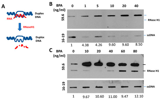 BPA-Induced R-Loop Formation and Detection. (A) Diagram illustrating the RNase H1 treatment procedure. (B,C) Slot blot analysis using S9.6 antibody [80] to detect global RNA–DNA hybrids in MCF7 cells. Cells were treated with various concentrations of BPA (0, 1, 5, 10, 20, 40, 60, 80, and 100 ng/mL) for 48 h. Denatured DNA was detected using a single-strand DNA antibody (16–19). RNase H1 treatment was applied as indicated. Quantitative analysis of nucleic acid bands from slot blot films was carried out using ImageJ software, https://imagej.nih.gov/ij/download.html, accessed on 16 August 2023. Each signal was normalized to ssDNA and presented as a fold increase compared to the control.