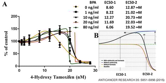 Modulation of Chemo-Sensitivity by BPA in MCF7 Cells. (A) MCF7 cells were initially seeded at 5 × 103 cells per well. After 24 h, cells were replenished with 100 µL of fresh medium containing specified doses of 4-hydroxytamoxifen and BPA for 96 h. Subsequently, 50 µL of XTT solution was added to each well and incubated for 4 h at 37 °C. The absorbance at 450 nm was measured using a microplate reader. Growth inhibitory effects were assessed using GraphPad software (https://www.graphpad.com/, accessed on 16 August 2023) to determine the EC50 values. Each data point represents the mean ± SEM of six replicates. (B) Representative hormetic dose-response curve [81] illustrates the complex relationship between BPA doses and inhibition of cell growth.