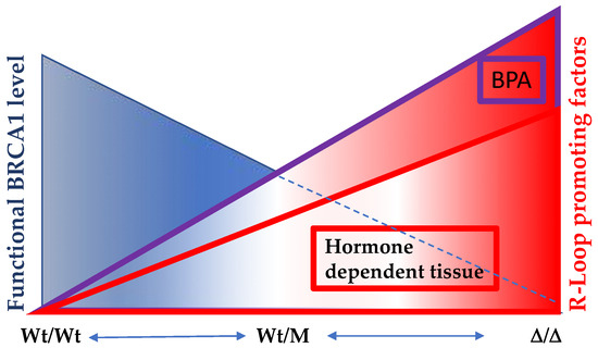 The significance of optimal functional levels of BRCA1 in hormone-dependent tissues extends to the regulation of R-Loop formation. In individuals harboring two copies of wild-type BRCA1 (Wt/Wt), the capacity to resolve R-Loop structures is at its peak. However, among carriers of BRCA1 mutations (Wt/M), the efficacy of R-Loop resolution varies depending on the mutation site. In cases where one copy of the wild-type allele is lost, the remaining allele displays diminished R-Loop resolving activity. Notably, this BRCA1-mediated R-Loop resolution becomes particularly crucial in hormone-dependent tissues, where active transcription sites are susceptible to heightened R-Loop formation. Compounding this scenario is the presence of estrogen-like compounds, such as BPA, which exacerbates R-Loop formation and overwhelms BRCA1’s capacity to counteract it. Consequently, an accumulation of DNA double-strand breaks (DSBs) ensues. Regrettably, BRCA1 also plays a pivotal role in DNA double-strand break repairs, thus creating a challenging situation where compromised BRCA1 function contributes both to increased R-Loop-induced damage and impaired DSB repair processes.