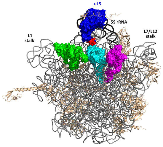 The bacterial 50S ribosomal subunit in the crown view with the three tRNAs in the E-, P-, and A-sites (green, cyan, and magenta, respectively). The deleted part of the P-site loop of uL5 (blue), contacting the P-site tRNA, is shown in red. The 23S rRNA, 5S rRNA, and r-proteins other than uL5 are shown in gray, black, and wheat, respectively. The figure was generated using the PyMOL Molecular Graphics System ver. 2.5; it is based on the crystal structure of the Thermus thermophilus 70S ribosome [6] (PDB entry 5DOY).