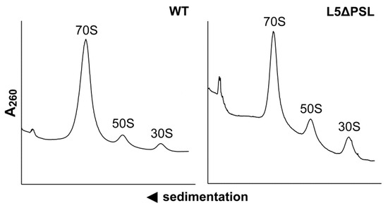 Distribution of 70S ribosomes and individual ribosomal subunits in lysates of the control strain MS129 (WT, left panel) and the mutant strain MS129a (uL5ΔPSL, right panel). Lysates were fractionated by ultracentrifugation in sucrose concentration gradients (5–20% w/v). Peaks corresponding to 70S ribosomes, large (50S), and small (30S) ribosomal subunits are indicated.