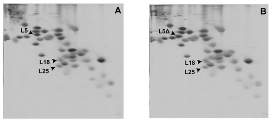 Protein composition of ribosomal fraction from the control strain MS129 (A) and the mutant strain MS129a (B). Spots of 5S rRNA-binding proteins uL5 (L5), its uL5ΔPSL variant (L5Δ), uL18 (L18), and bL25 (L25) are indicated with arrows.