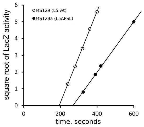 Rate of the protein synthesis in the ΔPSL mutant strain at 37 °C. Square root of LacZ activity (in Miller units) plotted vs. time after IPTG induction for the control strain MS129 (uL5 wt) and mutant strain MS129a (uL5ΔPSL). The x-intercept indicates time needed for the in vivo synthesis of the complete LacZ chain.