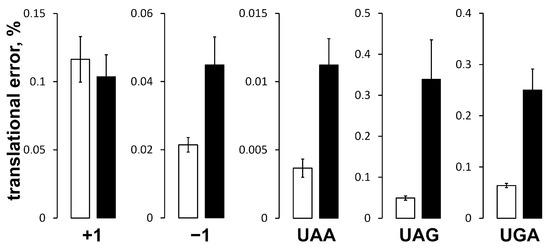 The decrease in the protein synthesis rate in the ΔPSL mutant is too small to be solely responsible for 2.5-fold reduced growth rate. Another potential problem could be compromised translation fidelity. To estimate translation fidelity in the ΔPSL mutant, six MG1655-based E. coli strains carrying reporter lacZ fusions in the chromosomal lac locus were constructed. These fusions comprise mutant lacZ ORFs containing +1, −1 frameshifts or premature stop codons: UAA, UAG, and UGA, based on the sequences published in [7]. A corresponding “wild type” lacZ fusion was constructed, which was used for the normalization of the results. Then, the rplE1::cat (wild type uL5) and rplEΔ73–80::cat (uL5ΔPSL) alleles were transferred into these reporter strains. The LacZ activity is proportional to the frequency of frameshifting and readthrough of stop codons present in the corresponding lacZ variants. LacZ activity was measured in exponentially growing cultures. To compare the activities of each dissected fusion, the results were represented as a ratio of activity of the reporter lacZ fusion variant to the activity of the control “wild type” lacZ fusion (Figure 7) in the corresponding genetic background (control rplE1::cat or mutant rplEΔ73–80::cat).