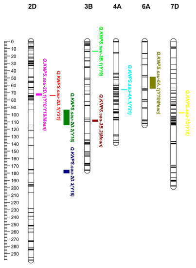 Additive QTLs for kernel number per spike (KNPS) in the genetic map. Eight additive QTLs for KNPS were mapped to chromosomes 2D, 3B, 4A, 6A, and 7D. The major and stable QTL QKnsp.sau-2D.1 was mapped to chromosome 2D. The positions, intervals, and markers closest to these QTLs are listed in Table 3. The scale of the linkage map is 1 cM and is shown on the left.