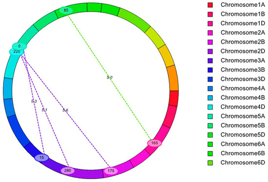 Among the yield components, KNPS has the greatest effect on yield, and its potential to increase yield is also the greatest [10,11,12,13]. The improvement of KNPS is the key goal of wheat breeding for a high yield. However, kernel-related traits are controlled by multiple genes and susceptible to environmental influences. Therefore, exploring major and stable QTLs and developing cost-effective molecular markers can reduce input and improve breeding efficiency, which is of great significance for wheat yield improvement. To date, there have been several reports of QTLs that can improve KNPS in wheat and distribute on 1A, 2A, 4A, 6A, 7A, 2B, 4B, 5B, 7B, 6D, and 7D chromosomes [14,15,16,17,18]. However, most of the reported QTLs were positive for KNPS and were also negative for TKW [4,19,20]. Many genes related to KNPS were cloned, such as GN1a [21], DEP1 [22], TAW1 [23], FON4 [24], etc. However, most of them were cloned from rice. Much fewer genes related to KNPS have been cloned in wheat, such as TaTEF-7A and GNI-A1 [5,25]. GNI-A1 was cloned from the QTL for KNPS on chromosome 2AL and encoded HD-ZIP type I transcription factor. With the mutation with GNI-A1, wheat was found to be able to produce more KNPS and a significant effect on kernel size was not observed [5]. Moreover, there are currently too few reports about loci that can increase KNPS without decreasing TKW.