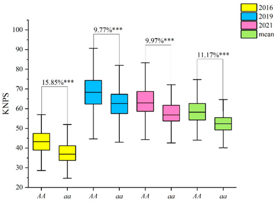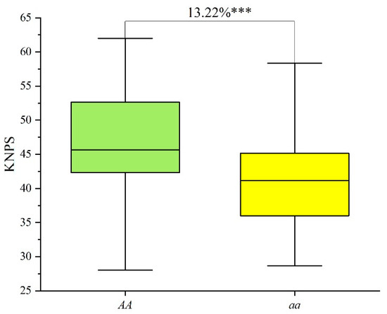 With the genotype of the CT population, we evaluated the genetic effect of QKnps.sau-2D.1. The results showed that the phenotypic values of KNPS for lines of the AA genotype were 43.29, 68.64, 63.56, and 58.41 in different years and in the mean values, respectively (Table S4). However, the phenotypic values of KNPS for lines of the aa genotype were 37.36, 62.53, 57.80, and 52.54 in different years and in the mean values, respectively (Table S4). The results of the t-test showed that the AA genotypes had significantly higher phenotypic values of KNPS in all three years (15.85%, 9.77%, and 9.97%) and in the mean value (11.17%) than the aa genotypes (p < 0.001) (Figure 3, Table S4).