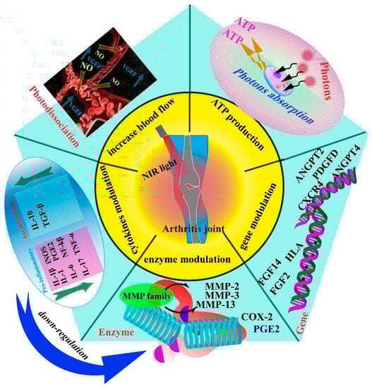 In RA patients, IL-1β and TNF-α can stimulate matrix metalloproteinase (MMP-13), which degrades all components of the extracellular matrix, including cartilage in joints. MMPs-1 also plays a crucial role in cartilage degradation in both RA and OA. Moreover, other MMPs, such as MMP-2 and MMP-3, are expressed in arthritic joints, and their content is increased [87]. Therefore, inhibiting MMP production is vital for preventing cartilage damage. A recent study demonstrated that irradiation with an 808 nm laser at 50 J/cm2 can significantly reduce the contents of COX-1 and MMP-13 in arthritic mice [77]. PBM plays a critical role in regulating the content and viability of enzymes associated with arthritis, protecting articular cartilage, and reducing the inflammatory effects of arthritis. In a word, PBM effectively reduces COX-2 content, leading to the inhibition of PGE2 production, relieving pain, and swelling in joints. Additionally, it inhibits metalloprotein enzymes, alleviating the erosion and degradation of joint tissues and components, preserving the normal function of joints.