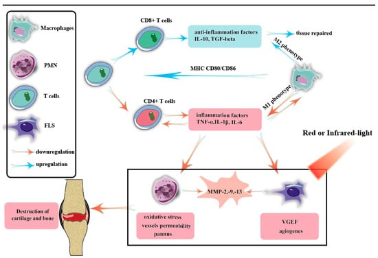 Macrophages play a crucial role in the pathogenesis of RA through antigen presentation, osteoclast generation viability, and secretion of proinflammatory cytokines such as TNF-α, IL-1, and IL-6 [95]. TNF-α promotes the expression of other cytokines, while IL-1β induces the release of adenosine from monocytes, activates PMN and oxidative stress, and increases the release of cytokines and chemokines from synovial fibroblasts. IL-1β and TNF-α can also activate the release and production of MMPs. On the other hand, IL-6 facilitates the proliferation of T and B cells, antibody production, hematopoiesis, and platelet formation [96,97]. It is noteworthy that macrophages have two phenotypes with completely different functions in response to inflammation. For example, M1 macrophages regulate inflammation and cell proliferation during muscle repair, while M2 macrophages guide differentiation and remodeling and promote tissue regeneration. However, 780 nm and 660 nm lasers (1 J/cm2) can effectively reduce the M1 phenotype macrophages while increasing the expression of M2 phenotype and reducing the content of proinflammatory cytokines [98]. Therefore, exploring the regulation of macrophage phenotype by PBM is also a promising approach for the treatment of RA. Different light power densities also have different regulatory effects. Alves et al. irradiated OA mice with 808 nm laser at 50 mW/cm2 and 100 mW/cm2 power density, respectively. The results showed that 50 mW/cm2 laser inhibited the secretion of IL-1β and IL-6 in macrophages more effectively. A power density of 100 mW/cm2 was more effective in reducing TNF-α production, suggesting that PBM can directly regulate inflammatory cytokine secretion of macrophages in addition to regulating macrophage phenotypes [76].
