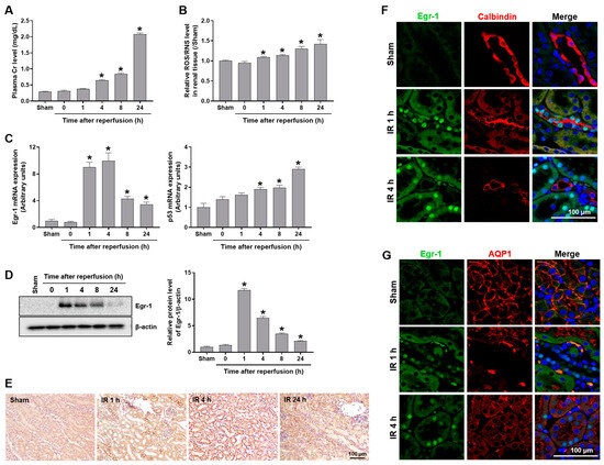 Egr-1 expression induced after renal IR injury in mice. Plasma and kidney tissues were collected from C57BL/6 mice subjected to either a sham operation, or 25 min of bilateral renal ischemia, followed by reperfusion, for the indicated durations. (A) Plasma creatinine and (B) renal ROS/RNS levels were measured. (C) Egr-1 and p53 mRNA expression were measured using real-time quantitative PCR analysis. (D) Egr-1 protein expression was measured using Western blot analysis; relative protein levels were determined with β-actin as a loading control. (E) Representative images of Egr-1 immunohistochemical staining: Egr-1 was localized in renal tubules. (F,G) Representative images of Egr-1 immunofluorescence staining: Egr-1 was co-stained with a proximal tubular marker (AQP1) or a distal tubular marker (calbindin). The data are presented as mean ± SEM. * p < 0.05 vs. sham group. Scale bar, 100 μm. Egr-1—early growth response 1; IR—ischemia–reperfusion; ROS/RNS—reactive oxygen/nitrogen species; AQP1—aquaporin-1.