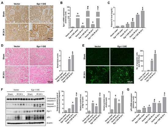 Egr-1 overexpression exacerbated renal damage and tubular apoptosis after renal IR injury in mice. At 24 h after intrarenal injection of Egr-1 plasmid or control vector, C57BL/6 mice were subjected to either a sham operation, or 25 min of bilateral renal ischemia, followed by 4 or 24 h of reperfusion. Kidney tissues were collected at the indicated times. (A) Representative images of Egr-1 immunohistochemical staining. (B) Egr-1 mRNA expression was measured using real-time quantitative PCR analysis. (C) Plasma creatinine levels were measured. (D) Representative H&E images of the kidney: the extent of renal injury was scored. (E) Representative TUNEL images: the number of TUNEL-positive cells was counted. (F) The protein expressions of Egr-1, p53, and uncleaved or cleaved caspase-3 were measured using Western blot analysis; relative protein levels were determined with β-actin as a loading control. (G) p53 mRNA expression was measured using real-time quantitative PCR analysis. The values are expressed as mean ± SEM. * p < 0.05 vs. control sham group. # p < 0.05 vs. control IR 4 h group. $ p < 0.05 vs. control IR 24 h group. Scale bar, 100 μm. Egr-1—early growth response 1; IR—ischemia–reperfusion; H&E—hematoxylin and eosin; TUNEL—terminal deoxynucleotidyl transferase dUTP nick-end labeling.