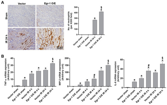 Egr-1 overexpression exacerbated neutrophil infiltration and proinflammatory cytokine production after renal IR injury in mice. At 24 h after intrarenal injection of Egr-1 plasmid or control vector, C57BL/6 mice were subjected to either a sham operation, or 25 min of bilateral renal ischemia, followed by 4 or 24 h of reperfusion. Kidney tissues were collected at the indicated times. (A) Representative images of Ly-6B.2 immunohistochemical staining for neutrophil infiltration: the number of stained neutrophils was counted. (B) The mRNA expressions of TNF-α, MIP-2, and IL-6 were measured using real-time quantitative PCR analysis. The values are expressed as mean ± SEM. * p < 0.05 vs. control sham group. # p < 0.05 vs. control IR 4 h group. $ p < 0.05 vs. control IR 24 h group. Scale bar, 100 μm. Egr-1—early growth response 1; IR—ischemia–reperfusion; TNF-α—tumor necrosis factor-α; MIP-2—macrophage inflammatory protein-2; IL-6—interleukin-6.