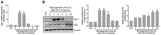 Egr-1 and p53 expression were induced by hypoxia and reoxygenation in renal proximal tubular cells. Proximal tubular HK-2 cells were exposed to 24 h of hypoxia, followed by reoxygenation at the indicated times. (A) Egr-1 mRNA expression was measured using real-time quantitative PCR analysis (B) The protein expressions of Egr-1 and p53 were measured using Western blot analysis; relative protein levels were determined with β-actin as a loading control. The values are expressed as mean ± SEM. * p < 0.05 vs. control group. Egr-1—early growth response 1; HK-2—human kidney 2.