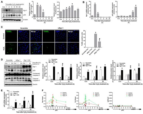 To investigate the role of Egr-1 on p53-mediated tubular apoptosis under oxidative stress, HK-2 cells were exposed to hydrogen peroxide (H2O2) for 1–24 h, and the protein and mRNA levels of Egr-1 and p53 were measured. Egr-1 protein levels increased at 1–2 h after H2O2 treatment, and p53 protein levels significantly increased at 2–8 h after H2O2 treatment (Figure 5A). Egr-1 mRNA levels also increased at 1–2 h after H2O2 treatment, and p53 mRNA levels significantly increased at 16–24 h after H2O2 treatment (Figure 5B).