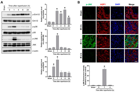 Renal IR increased MAPK phosphorylation, and p-JNK was induced in proximal tubules at 1 h after reperfusion of mice. Kidney tissues were collected from C57BL/6 mice subjected to either a sham operation, or 25 min of bilateral renal ischemia, followed by reperfusion of the indicated durations. (A) The protein expressions of p-Erk1/2, Erk1/2, p-p38, p38, p-JNK, and JNK were measured using Western blot analysis; relative protein levels were determined with β-actin as a loading control. (B) Representative images of p-JNK immunofluorescence staining: Egr-1 was co-stained with a proximal tubular marker, AQP1. The fluorescence intensity of p-JNK was measured using Image J. The data are presented as mean ± SEM. * p < 0.05 vs. sham group. Scale bar, 100 μm. Egr-1—early growth response 1; IR: ischemia–reperfusion; MAMK—mitogen-activated protein kinase; JNK—c-Jun N-terminal kinase; Erk—extracellular signal-regulated kinase; AQP1—aquaporin-1.