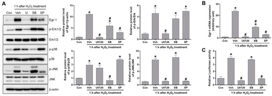 Egr-1 expression was induced through the phosphorylation of Erk and JNK in H2O2-treated proximal tubular cells. HK-2 cells were pretreated with either U0126 (100 nM), SB203580 (10 nM), or SP600125 (10 μM) 1 h prior to H2O2 (600 μM) treatment, and then the cells were collected after 1 h of H2O2 treatment. (A) The protein expressions of Egr-1, p-Erk1/2, Erk1/2, p-p38, p38, p-JNK, and JNK were measured using Western blot analysis; relative protein levels were determined with β-actin as a loading control. (B) Egr-1 mRNA expression was measured using real-time quantitative PCR analysis. (C) Dual-luciferase activity was measured in the cells transfected with reporter constructs, containing Egr-1 binding sites with luciferase (Egr-1-Luc), or Renilla luciferase (RLuc) as an internal control. The values are expressed as mean ± SEM. * p < 0.05 vs. control group. # p < 0.05 vs. vehicle+ H2O2-treated group. Egr-1—early growth response 1; JNK—c-Jun N-terminal kinase; Erk—extracellular signal-regulated kinase.