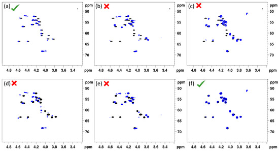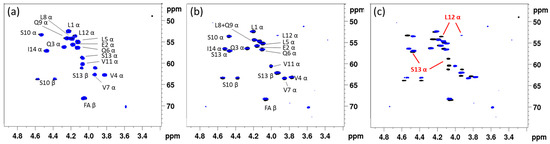 Figure 2 shows the overlay of the (CHα) fingerprint region of the 1H-{13C} HSQC in DMF-d7 of each synthesized (14:5) sequence with that of natural entolysin A and B from P. entomophila COR5, all recorded under otherwise identical conditions. A straightforward visual assessment clearly indicates that the fingerprint of the L-Ser13 (1) variant displays a quasi-perfect match with entolysin A (Figure 2a), while the fingerprint of the L-Ser10 (2) variant is clearly mismatched (Figure 2b), thus clearly indicating Ser 10 and Ser13 are D- and L-configured, respectively. As can be expected, the fingerprint of the D-Ser10/D-Ser13 (3) homologue is also mismatched (Figure 2c). Considering these three variants against entolysin B (Figure 2d–f), an excellent match is only observed with D-Ser10/D-Ser13 (3) (Figure 2f), clear mismatches appearing with the other L-Ser-containing homologues (Figure 2d,e). The match of entolysin A, respectively, entolysin B with L-Ser13 (1) and D-Ser10/D-Ser13 (3) also settles the configuration of L-Leu1, inferred from C-domain analysis (see above). The results obtained here definitively prove, therefore, that the entolysin NRPS systems in P. entomophila L48T and COR5 produce diastereomeric lipopeptides, only differing in the configuration of the penultimate Ser13 residue.