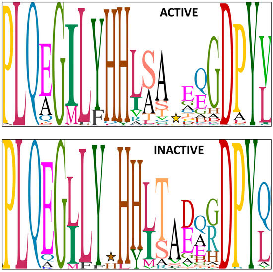 Sequence logo for the N-terminal secondary histidine motif present in E/C-type domains of Pseudomonas lipopeptide NRPS systems, excluding P. entomophila NRPS systems. Herein, the relative proportion of a particular amino acid at a particular position is represented by the size (height) of the amino acid. The sequence logo for active, respectively, inactive E/C-domains is based on 394 and 74 sequences, respectively, with experimentally proven outcome with regards to epimerization activity. A star marks the location of an apparent amino acid insertion (histidine or proline) occurring in some E/C-domains. More specifically, ACTIVE panel (top): the ‘gap’ is due to an extra residue (proline) in some WLIP synthetases (WlmC, C9; COW40, COR54); INACTIVE panel (bottom): the ‘gap’ (small H) is due to an extra residue (histidine) in JesB/jessenipeptin (C8) and in FusA/fuscopeptin (C4) [40].