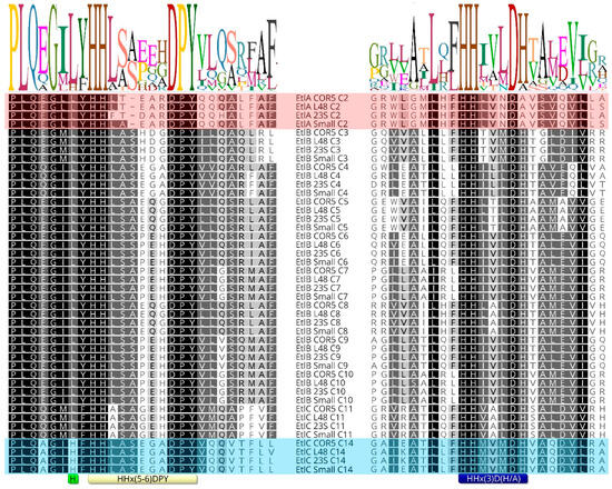 Since both entolysin homologues are produced by a single tripartite NRPS system and this recruits L-amino acids from the primary metabolism, the stereochemical heterogeneity at Ser13 most likely originates because the E/C-domain of module 14 is intermittently active in its epimerization activity. Conventional C-domains, only capable of condensing L-amino acids (i.e., LCL-domains) into the growing peptide chain and devoid of epimerization functionality, feature an active site with a conserved histidine-containing HHxxxDG motif, in which the second histidine (H) is crucial for catalysis [15,38]. The dual E/C-domains present in Pseudomonas CLiPs carry an equivalent HHxxxDH motif, with an extra histidine (or less frequently, alanine or asparagine) substituting for the glycine [15,39]. In addition, the dual E/C-domains invariably exhibit a second histidine sequence motif, with the proposed consensus sequence HH[I/L]xxxxGD located close to the N-terminus of the domain [23,38]. In effect, the presence of this second motif allows for identifying the presence of E/C-domains and, therefore, predicts the presence of D-amino acids in the sequence. As noted above, experimental verification of the configuration of amino acids in Pseudomonas CLiPs has shown that the epimerization by these E/C-domains does not always occur. While several other motifs have been tentatively linked to the inability of E/C-domains to perform epimerization, there is no clear consensus on this [23]. Indeed, this is hampered by substantial variation in the consensus HH[I/L]xxxxGD second histidine sequence motif in Pseudomonas species, both for those epi-active and those epi-inactive (Figure 3).