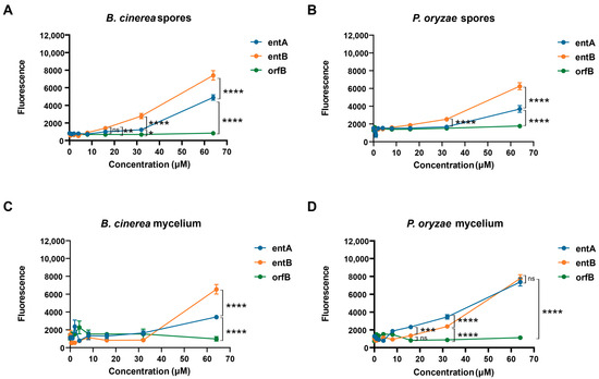 Entolysin A and entolysin B cause membrane leakage of fungal mycelium and spores. Entolysin A (entA), entolysin B (entB) and orfamide B (orfB) activity against (A) B. cinerea spores, (B) P. oryzae spores, (C) B. cinerea mycelium, (D) P. oryzae mycelium. The fluorescence, shown in the figure, was measured 2 h after treatment. The bars indicate the standard error (n = 8). Entolysin A, entolysin B and orfamide B were compared by two-way ANOVA analysis. Significant differences at p > 0.05, p ≤ 0.05, p ≤ 0.01, p ≤ 0.001 and p ≤ 0.0001 were marked as (ns), single (*), double (**), triple (***) and quadruple (****), respectively. All experiments were carried out in eight biological replicates.
