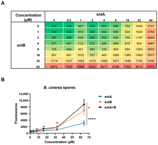 Checkerboard assay between entolysin A and entolysin B. (A) Checkerboard analysis of entolysin A (entA) and entolysin B (entB). The number in each cell is the mean fluorescence value of triplicates; green color indicates low activity against B. cinerea R16 spores, red color indicates high antifungal activity against B. cinerea R16 spores. (B) Comparison between entA, entB and entA + B (1:1 ratio) against B. cinerea R16 spores. The fluorescence, shown in the figure, was measured after 2 h of treatment. The vertical bars indicate the standard error (n = 3). The fluorescence values by entolysin A, entolysin B and entolysin A + B treatments were compared by two-way ANOVA analysis. Significant differences at p > 0.05, p ≤ 0.05 and p ≤ 0.0001 were marked as (ns), single (*) and quadruple (****), respectively.