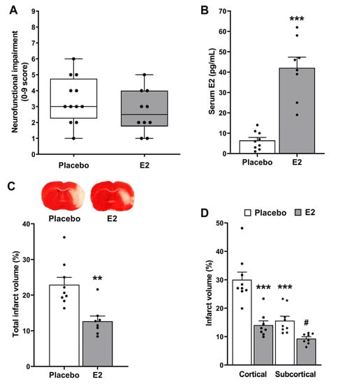 At 24 h after the onset of ischemia, neurofunctional examination of fully recovered ovariectomized rats revealed that there was a slight tendency towards improvement of the neurofunctional status of the E2-treated animals (neurological score, 2.5 [1.75, 4]) compared with the placebo group (3 [2.25, 4.75]). However, this improvement was not statistically significant (p = 0.27; Figure 1A). Serum estradiol levels at the time of sacrifice were 6.4 ± 1.5 pg/mL in the placebo group and significantly increased in the E2 group (42.1 ± 5.2 pg/mL, p < 0.001; Figure 1B).
