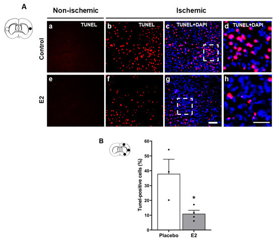 TUNEL-positive cells were undetectable in the cortex of the non-ischemic hemisphere of rats subjected to tMCAO, whether or not they were treated with E2 (Figure 2A(a,e)). By contrast, ischemia/reperfusion induced the presence of TUNEL-positive cells in the ischemic hemisphere cortex of both placebo- (Figure 2A(b–d)) and E2-treated groups (Figure 2A(f–h)). However, ischemic hemisphere from E2-treated animals showed significantly lower TUNEL-positive cell counts (10.9 ± 2.4%) compared with those from placebo-treated animals (37.9 ± 9.9%, p < 0.05). Overall, this represented a decrease in approximately 74% (Figure 2B).