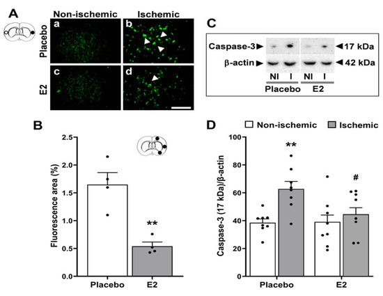 In close agreement with the results from the TUNEL assay, caspase-3 activity was undetectable in the non-ischemic hemisphere (Figure 3A(a,c)). By contrast, ischemia/reperfusion induced caspase-3 activity in the ischemic hemisphere from placebo (Figure 3A(b)) and E2-treated groups (Figure 3A(d)). Once again, marked differences among groups were statistically significant as caspase-3 activity was strongly inhibited in the ischemic hemisphere of E2-treated rats (0.5 ± 0.08%) vs. placebo (1.7 ± 0.2%, p < 0.01, Figure 3B). Accordingly, Western blot studies showed significantly higher levels of activated caspase-3 p17 in the ischemic vs. non-ischemic hemisphere (p < 0.01). In the post hoc analysis, activated caspase-3 p17 significantly increased in the ischemic hemisphere (62.8 ± 5.3) vs. non-ischemic hemisphere (38.5 ± 2.7, p < 0.01) of placebo-treated group. In the ischemic hemisphere, E2 pretreatment significantly reduced activated caspase-3 p17 (45.7 ± 5.5) vs. placebo (62.8 ± 5.3, p < 0.05, Figure 3C,D).