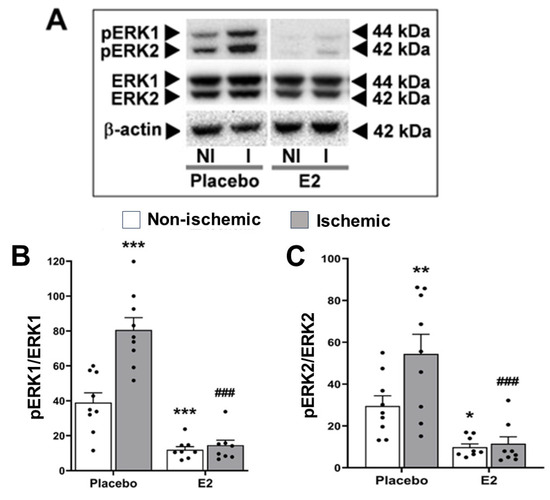 Regarding estrogen pretreatment, E2 significantly decreased phosphorylation of both ERK1 (p < 0.001) and ERK2 (p < 0.001) vs. placebo-treated group. There were significant interactions between E2 and ischemia-reperfusion effects on changes in both pERK1 (p < 0.001) and, to a lower extent, pERK2 (p < 0.05). In the post hoc analysis of the non-ischemic hemisphere, E2 significantly reduced both pERK1 (12.2 ± 1.9) and pERK2 (10.1 ± 1.7) vs. placebo-treatment (39.0 ± 5.6, p < 0.001, and 29.5 ± 4.8, p < 0.05, respectively, Figure 4A–C). In the ischemic hemisphere, E2 also significantly reduced both pERK1 (13.9 ± 3.1) and pERK2 (10.9 ± 3.6) vs. placebo treatment (80.6 ± 7.0, p < 0.001, and 54.4 ± 9.4, p < 0.001, respectively, Figure 4A–C).