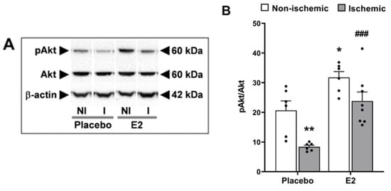 We examined the effect of E2 on activation of the pro-survival PI3K/Akt signaling pathway. Ischemia/reperfusion significantly decreased phosphorylation of Akt (pAkt) at Ser473 (p < 0.001). Post hoc analysis showed that pAkt from the placebo-treated group significantly decreased in the ischemic hemisphere (8.4 ± 0.6) vs. non-ischemic hemisphere (20.7 ± 3.2, p < 0.01, Figure 5A,B). On the other hand, E2 significantly increased phosphorylation of Akt (p < 0.001) vs. placebo-treated group. According to the post hoc analysis, E2 significantly increased pAkt when compared to placebo in both the non-ischemic hemisphere (31.8 ± 2.0 in E2 vs. 20.7 ± 3.2 in placebo, p < 0.05) and ischemic hemisphere (23.8 ± 3.0 in E2 vs. 8.4 ± 0.6 in placebo, p < 0.001, Figure 5A,B), thus attenuating the ischemia-induced decrease in pAkt.