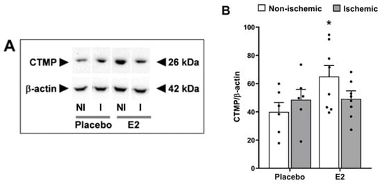 Estradiol increases the CTMP protein expression. Carboxy-terminal modulator protein (CTMP) protein expression in brains from placebo- and E2-treated ovariectomized female rats subjected to tMCAO. (A) Representative Western blots and (B) relative abundance of CTMP in whole-cell lysates of non-ischemic (NI) and ischemic (I) hemispheres. Two-way ANOVA: E2 vs. placebo, p = 0.08, F1,24 = 3.1). Post hoc Sidak’s multiple comparisons test: significantly different from non-ischemic placebo group (* p < 0.05). Data are mean ± SEM of individual data points (normalized to β-actin). E2, 17β-estradiol. tMCAO, transient middle cerebral artery occlusion.
