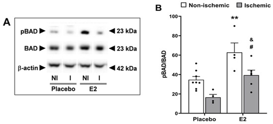 Ischemia/reperfusion significantly decreased the phosphorylation status of the pro-apoptotic protein BAD at Ser136 (p < 0.01) vs. non-ischemic hemisphere. Post hoc analysis showed that pBAD from the E2-treated group significantly decreased in the ischemic hemisphere (39.3 ± 5.2) vs. non-ischemic hemisphere (62.8 ± 9.8, p < 0.05, Figure 7A,B). On the other hand, E2 significantly increased phosphorylation of BAD (p < 0.001) vs. placebo-treated group. According to the post hoc analysis, E2 significantly increased pBAD when compared to placebo in both the non-ischemic hemisphere (62.8 ± 9.8 in E2 vs. 34.6 ± 3.4 in placebo, p < 0.01) and ischemic hemisphere (39.3 ± 5.2 in E2 vs. 16.5 ± 3.0 in placebo, p < 0.05, Figure 7A,B), thus attenuating the ischemia-induced decrease in pBAD.