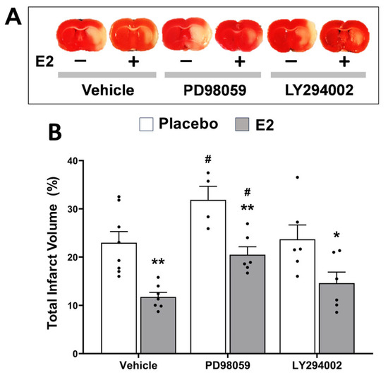 In contrast, LY294002 treatment did not significantly alter the infarct volume (p = 0.9) vs. vehicle treatment. Accordingly, the post hoc analysis showed that E2 significantly reduced the infarct volume when compared to placebo in both the vehicle (11.7 ± 1.0% in E2 vs. 22.96 ± 2.3% in placebo, p < 0.01) and LY294002-treated group (14.6 ± 2.3% in E2 vs. 23.7 ± 3.0 in placebo, p < 0.05) (Figure 8A,B).