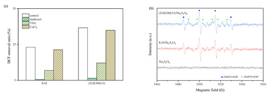 The 4 h removal ratio of DCF with different quenching agents in the KAl/PS and (26)KSM(10)/PS systems is shown in Figure 1a. It can be seen that the inhibition effects were similar in the two systems. DCF removal was almost completely suppressed when methanol existed in the solution, indicating that free radicals played dominant roles in the two oxidative systems. The tert-butanol (TBA) reduced the DCF removal ratio by 16.2% and 24.5%, respectively, which indicated that •OH played a more important role than •SO4−. The DCF removal ratios after a CuCl2 addition were 21.3% and 34.8%, respectively, which were slightly lower than those of the control (23.1% and 36.6%), indicating that •O2− might exist in the systems.