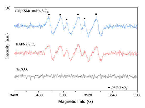 The quenching and electron paramagnetic resonance (EPR) spectra proved the existence of •OH, •SO4− and •O2−. It can be seen from Figure 1b that the typical addition products, DMPO-•SO4− and DMPO-•OH, were produced in the persulfate oxidation system. The peak intensity in the (26)KSM(10)/PS group was slightly higher than that in KAl/PS. The response of •OH was much stronger than that of •SO4−, meaning that •OH played a major role, which was consistent with the result from the quenching test. The •O2− was also found to have a strong response from the EPR result (Figure 1c).