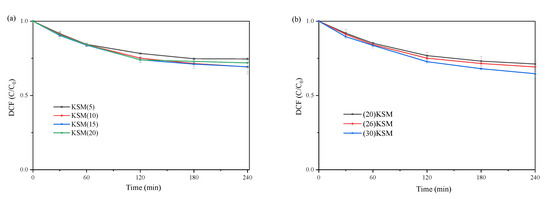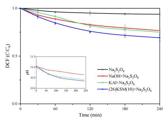 When 0.1 g of KAl or (26)KSM(10) was added to the 25.0 mL reaction solution, the initial pH values were 10.98 and 11.06, respectively. The pH of the NaOH/PS system was adjusted to 11.02. The DCF removal results are shown in Figure 3. It can be seen that all the base-activated persulfate systems had stronger oxidizing abilities than persulfate itself. DCF was removed in a similar ratio in the KAl and NaOH groups, while the degradation efficiency was significantly higher in the (26)KSM(10)/PS group after 4 h. The degradation reactions in the base-activated oxidation systems followed pseudo-first-order kinetics in the entire 4 h period.